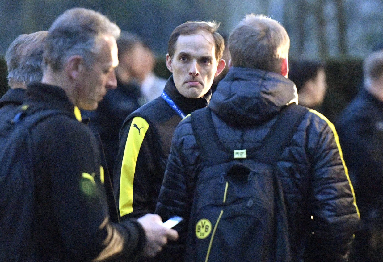 Dortmund head coach Thomas Tuchel stands outside the team bus after it was damaged in an explosion before the Champions League quarterfinal soccer match between Borussia Dortmund and AS Monaco in Dortmund, western Germany, Tuesday, April 11, 2017. (AP Photo/Martin Meissner)