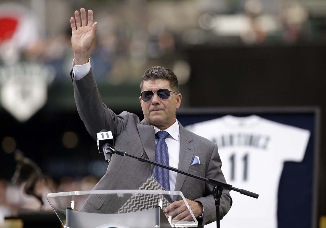 Former designated hitter Edgar Martinez waves as he concludes his remarks at a ceremony retiring his No. 11 before a baseball game between the Mariners and Los Angeles Angels, Saturday, Aug. 12, 2017, in Seattle. (AP Photo/Elaine Thompson)