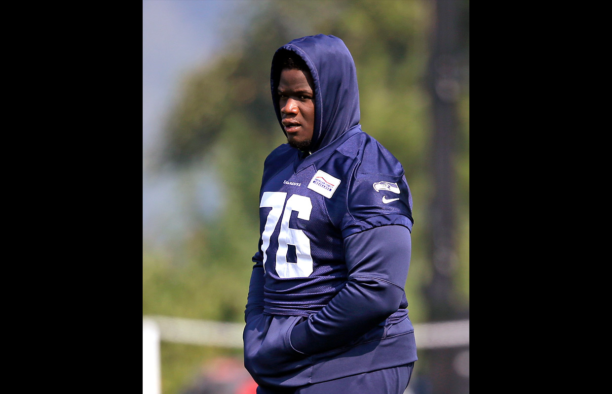 Seattle Seahawks’ Germain Ifedi walks onto the field during an NFL football training camp Friday, Aug. 4, 2017, in Renton, Wash. (AP Photo/Elaine Thompson)