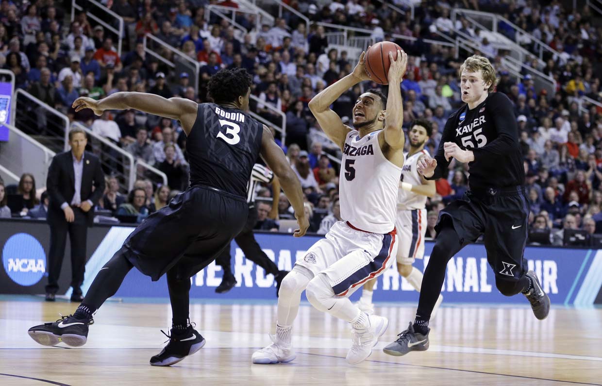 Gonzaga guard Nigel Williams-Goss (5) dribbles between Xavier guards Quentin Goodin (3) and J.P. Macura (55) during the second half of an NCAA Tournament college basketball regional final game Saturday, March 25, 2017, in San Jose, Calif. (AP Photo/Ben Margot)