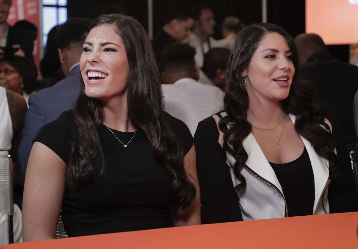 Kelsey Plum, left, waits with friends and relatives for the start of the WNBA basketball draft, Thursday, April 13, 2017, in New York. Plum was selected as the No. 1 overall pick by the San Antonio Stars. (AP Photo/Julie Jacobson)