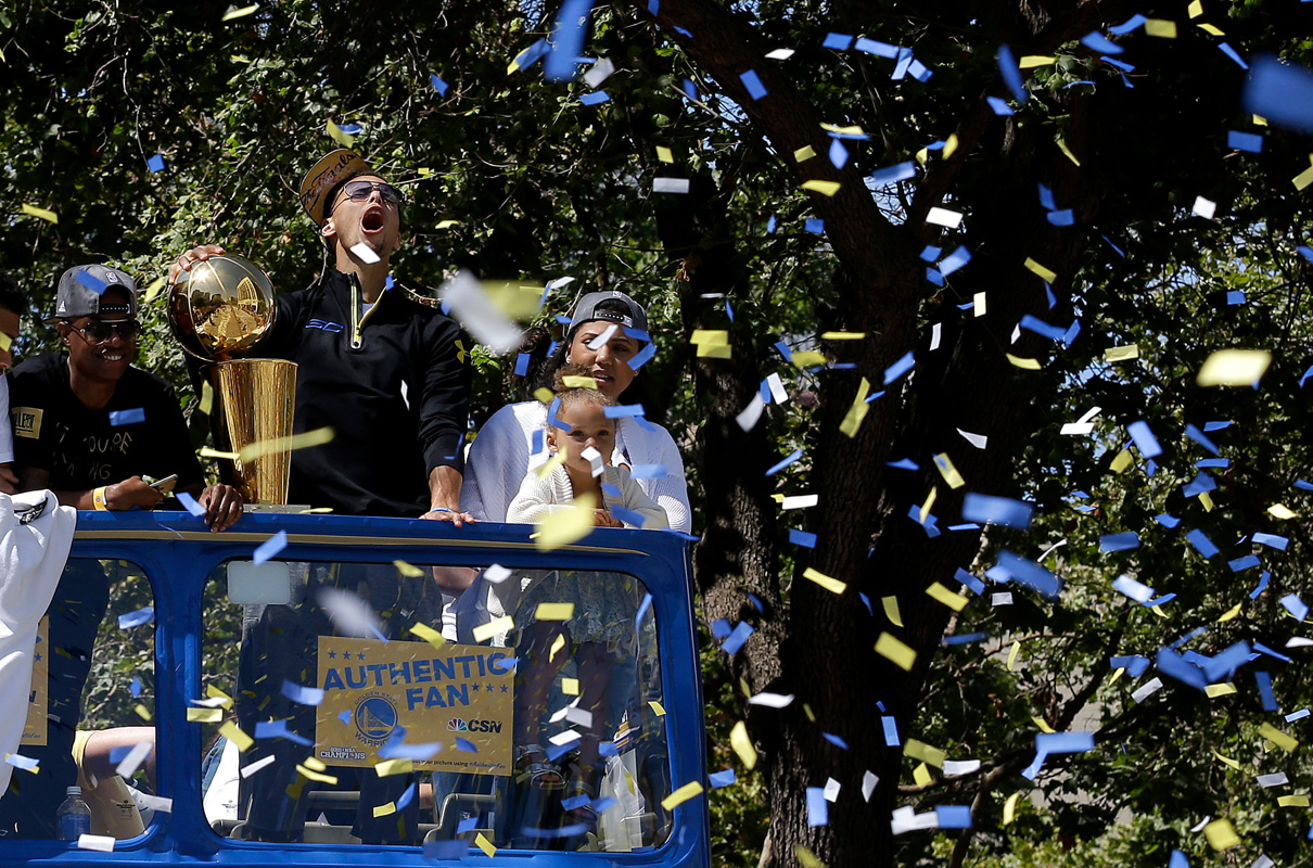 Stephen Curry held the Larry O’Brien trophy, his wife and kids beside him. He got off his bus and hopped and shouted as he gave high fives to the crowd. NBA Finals MVP Kevin Durant rode on a different bus with his mom.