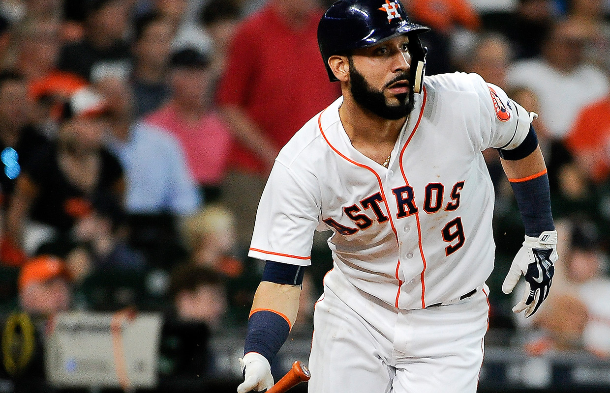 Houston Astros’ Marwin Gonzalez watches his double during the second inning