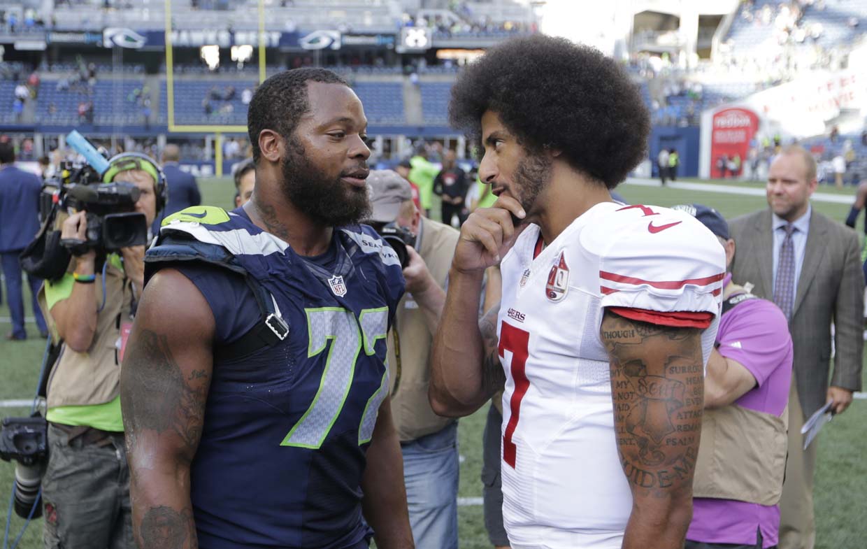 Seattle Seahawks’ Michael Bennett, left, talks with San Francisco 49ers’