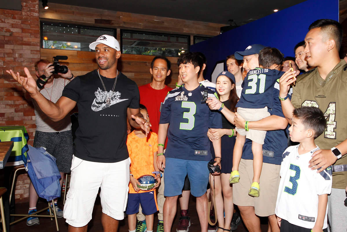 Wilson, left, speaks during a promotional event in Shanghai. The NFL