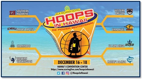 The 2018 Hoops in Hawai’i Classic will feature eight top Division II programs in a traditional bracket format where a tournament champion will be crowned. The complete tournament bracket and information on how to follow the games can be found at scoringlive.com/hoopsinhawaii.