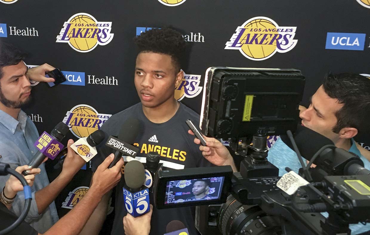 Markelle Fultz, center, speaks with reporters after his private workout with the Los Angeles Lakers at NBA basketball team’s training complex Thursday, June 15, 2017, in El Segundo, Calif. The University of Washington guard could be the No. 1 pick in the NBA draft (AP Photo/Greg Beacham)