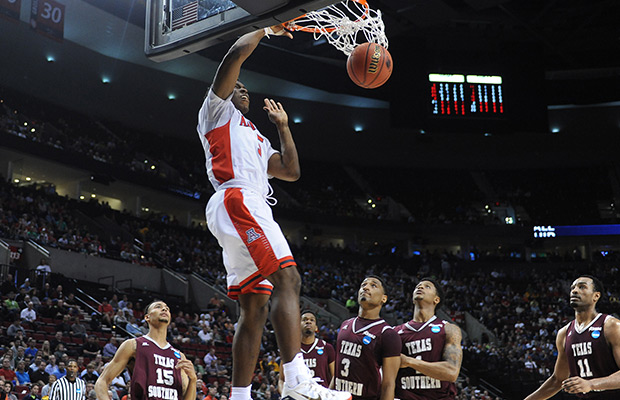 Arizona forward Stanley Johnson scores over Texas Southern players during the first half of an NCAA college basketball second round game in Portland, Ore., Thursday, March 19, 2015. AP Photo/Greg Wahl-Stephens