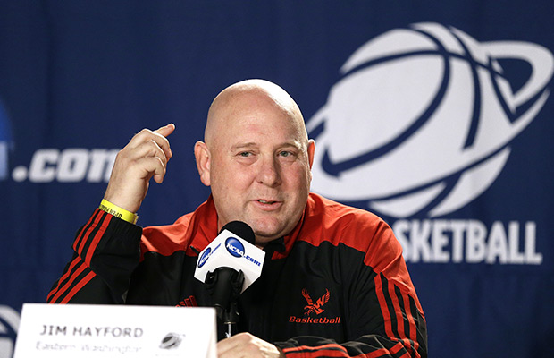 Eastern Washington coach Jim Hayford speaks before practice for an NCAA college basketball second round game in Portland, Ore., Wednesday, March 18, 2015. Eastern Washington will play Georgetown on Thursday. AP Photo/Don Ryan