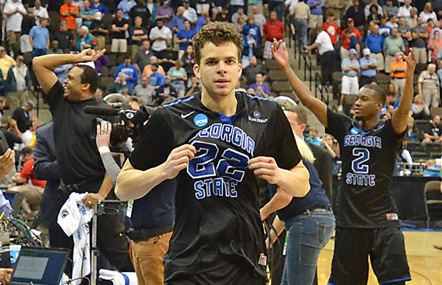 Georgia State’s R.J. Hunter (22) comes off the court after making a game winning shot against Baylor, as head coach Ron Hunter, back left, and Ryann Green (2) celebrate their 57-56 in the second round of the NCAA college basketball tournament, Thursday, March 19, 2015, in Jacksonville, Fla. AP Photo/Rick Wilson