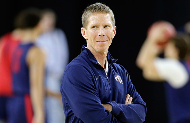 Gonzaga head coach Mark Few watches during a practice session for a college basketball regional semifinal game in the NCAA Tournament Thursday, March 26, 2015, in Houston. Gonzaga plays UCLA on Friday, March 27, 2015. AP Photo/Charlie Riedel