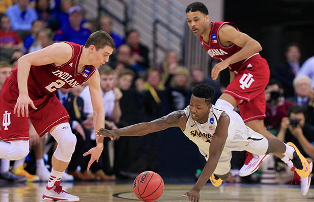 Indiana’s Nick Zeisloft (2) and Wichita State’s Zach Brown (1) go for a loose ball as Indiana’s James Blackmon Jr. (1) looks on, rear right, during the first half of an NCAA tournament college basketball game in the Round of 64 in Omaha, Neb., Friday, March 20, 2015.AP Photo/Nati Harnik