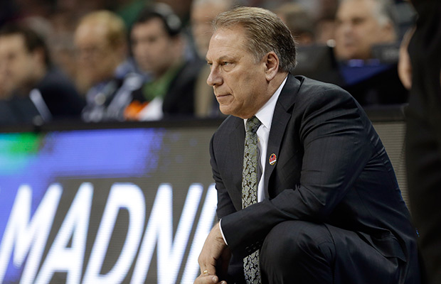 Michigan State head coach Tom Izzo watches his team against Georgia during the first half of an NCAA tournament college basketball game in the Round of 64 in Charlotte, N.C., Friday, March 20, 2015. AP Photo/Gerald Herbert