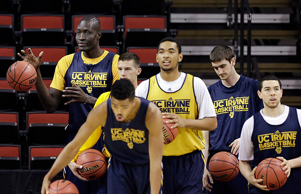 UC Irvine’s Mamadou Ndiaye, left, stands well above teammates as he reaches for a ball during practice at the NCAA college basketball tournament in Seattle, Thursday, March 19, 2015. UC Irvine plays Louisville in the second round on Friday. AP Photo/Elaine Thompson