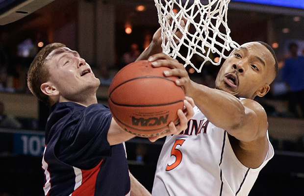Virginia’s Darion Atkins, right, blocks a shot by Belmont’s Craig Bradshaw, left, during the first half of an NCAA tournament college basketball game in the Round of 64 in Charlotte, N.C., Friday, March 20, 2015. AP Photo/Nell Redmond